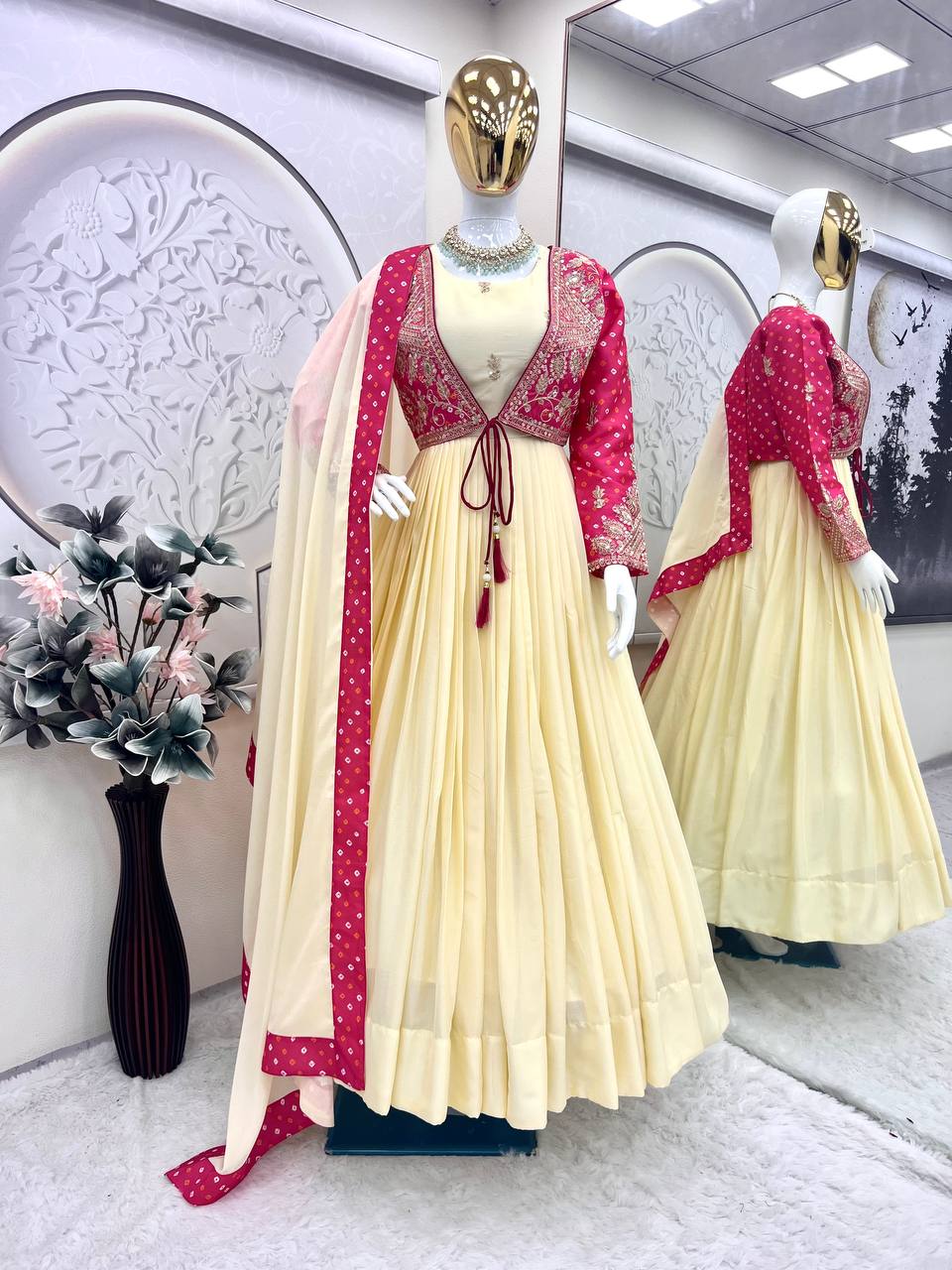 Premium Heavy Chinon Silk Gown with Embroidered Koti & Bandhani Dupatta